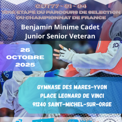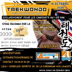 Intervenant : M. Christophe Legendre / Horaires : 14h00-16h00 / Public : Cadets, Juniors et Seniors / Prévoir : Dobok et tous matériels nécessaires pour le Combat