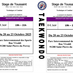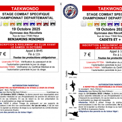 Stage TKD de la Toussaint. Tous les soirs du 20 au 23 octobre à partir de la catégorie Minimes.