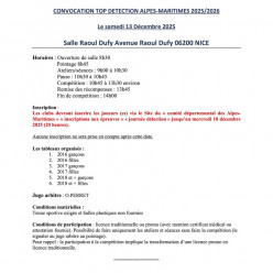 CONVOCATION TOP DETECTION ALPES-MARITIMES 2025/2026 Le samedi 13 Décembre 2025 Salle Raoul Dufy Avenue Raoul Dufy 06200 NICE Horaires : Ouverture de salle 8h30 Pointage 8h45 Ateliers/séances : 9h00 à 10h30 Pause : 10h30 à 10h45 Compétition : 1...