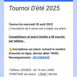 Publié le 21 août 2025Voici le lien qui vous permettra de vous inscrire à notre dernier tournoi l'été. Cest l'endroit et le moment idéal pour venir tape...