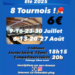 Publié le 15 août 2025Résultats de notre sixième tournoi 🏓 estival. Encore beaucoup de monde ce mercredi soir dans le complexe sportif de La Richardais...