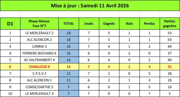 Publié le 31 mars 2026Résultats mitigés pour cette 5ème journée : 2 défaites Chailloué 1 face au leader Lonrai 1 sur le score de 8 à 2 et Chailloué 4 f...