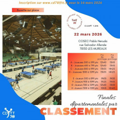 Vous trouverez ci-après tous les détails nécessaires sur cette compétition: Finales par Classement 2026 - COMITE 78 TENNIS DE TABL...