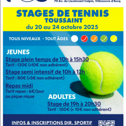 Nous vous proposons un stage, pendant les vacances scolaires, en journée pour les JEUNES, et le soir à partir de 19h pour les ADULTES. INSCRIPTION : voir affiche → A très bientôt sur nos nouveaux courts. Bien sportivement et amicalement, les Mem...