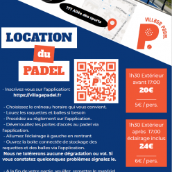 Publié le 20 septembre 2025Avec l'application smartphone Village Padel, vous pouvez réserver la piste de padel. Vous pouvez louez 4 raquettes...