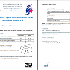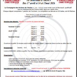 Le concours Beursault du samedi 18 avril fera suite à l'inauguration de notre Jeu d'Arc. Le déroulement de l'inauguration se fera comme suit: Places restantes samedi 18 avril 2026: Départ 1 => COMPLET Départ 2 => COMPLET Places restantes dim...