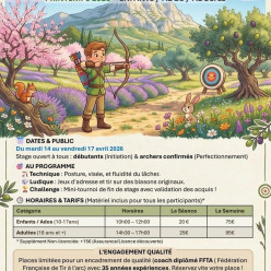 Stage de découverte du tir à l'arc, Février 2026 Stage en plein air. Pour tous : enfants à partir de 6 ans, adolescents et adultes. Programme : Notion de sécurité Initiation au tir à l'arc Jeux en équipe Découverte du tir sur cible angl...