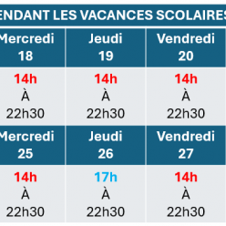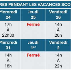 Merci de vous reporter au tableau joint pour connaître les horaires du Gymnase Ampère pendant les vacances scolaires.