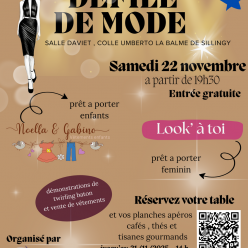 Défilé de mode enfants (mixte) et femme. Les commerçants : Noella & Gabino pour les enfants et Look' à toi pour les femmes proposeront ensuite leurs articles à la vente. Des démonstrations de nos athlètes auront lieu durant le défilé. Restauration...