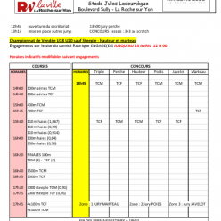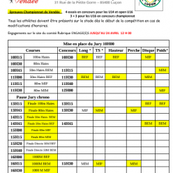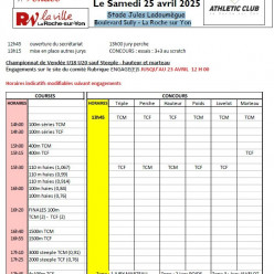 Rendez-vous à 8h20 sur le parking du stade où 1h avant le début de votre course/concours sur place Retour prévu vers 17h40 Ne pas oublier le maillot de club et les pointes ! Attention, je ne serais pas présente lors de cette compétition Répo...