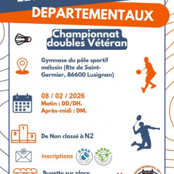 Le CODEP 86 est heureux de vous accueillir le dimanche 8 février 2026 à LUSIGNAN, à l’occasion du Championnat Départemental de la Vienne Vétéran (D et MX). Le Championnat est ouvert à tous les joueurs et joueuses, classés de N2 à NC, il se déroulera...